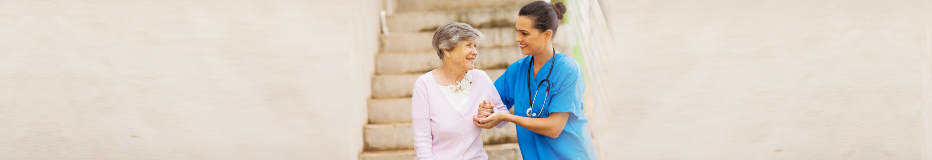 Smiling home caregiver and senior woman walking together
